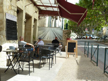 Via een mooi stukje weg noordwaarts naar Barbentane. Daar drinken we koffie en delen een salade waar veel rauwe rode kool in zit. Beetje te dik gesneden. Verder is de salade prima met spekjes, ei en tomaat. Barbentane is niet zo bijzonder. Veel houtwerk van de huizen mag wel eens geverfd worden, maar dat is in heel Frankrijk het geval. |