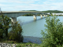 Verderop, bij de brug over de Rhône, kunnen we even stoppen voor een foto. Het dorpje Aramon ligt links aan de overkant. Deze brug heet dan ook Pont d'Aramon. |