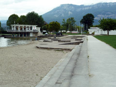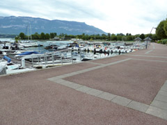Ondanks de grijze lucht rijden we een stukje terug naar de zuidpunt van dat grote meer, genaamd Bourget. Herman parkeert bij de jachthaven en we maken even snel een foto. De auto staat eigenlijk op een plek waar we niet mogen staan en dus zoeken we een andere plaats. Bij een tennisveld lukt dat. We wandelen naar het meer en als we bij het strandje aankomen begint het plots hard te waaien. De lucht boven de bergen belooft niet veel goeds. Toch maar weer naar de auto. Een goed besluit, want rond 17:00 uur als we op onze hotelkamer terug zijn barst de regen los. Plus wat onweer. |