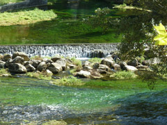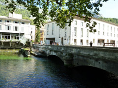 Het snelle water van de rivier de Sorgue en de spectaculaire manier waarop dit even buiten het dorp boven de grond komt heeft altijd mensen getrokken. Ook wij hebben er jaren geleden een glimp van mogen zien, toen was het namelijk ook druk met toeristen. De rivier stroomt ook door het dorp en is te bewonderen vanaf verschillende terrassen. We lopen langs het stromende, heldere water naar boven. |