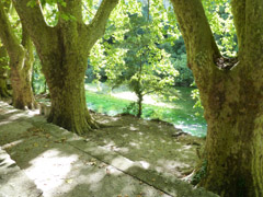 Als alternatief besluiten we naar Fontaine de Vaucluse te gaan. Dat ligt even ten oosten van Avignon. Ook daar is het druk, maar beter te behappen. Op een terrasje in de schaduw drinken we koffie met een stuk vijgentaart erbij. Dat smaakt wel, maar appeltaart vinden wij veel lekkerder. |