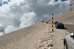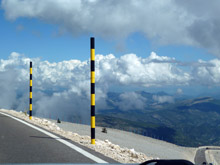 De Mont Ventoux lijkt nu toch wat meer in de zon te komen als we die oprijden. Meer wielrenners dan auto's op de weg. Een rit van 18 km naar boven. Prachtig uitzicht. En de bewolking is ook een foto waard. De top van de Mont Ventoux ligt op 1913 meter hoogte. Op die top bevindt zich een weerstation met een grote zendmast. |