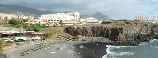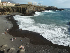 Als we een stukje lopen is daar een zwart strandje te zien in een kleine baai gelegen. Ook hier flinke golven. Er hangt