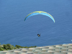 paragliders starten. We zien er een paar na een kort aanloopje wegzweven, de bocht nemen en verderop op een strand zullen ze buiten ons zicht gaan landen.