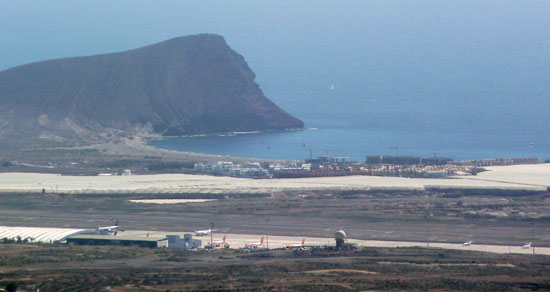 Hier zie je Montana Roja op een ander moment. Op de voorgrond is de luchthaven te zien en rechts van het midden staan bouwkranen aan de kust.