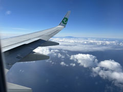 Met een half uur vertraging gaan we de lucht in. Het toestel is niet goed schoongemaakt… in de afvalzakjes zit nog viezigheid van de vorige vlucht.