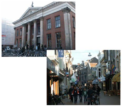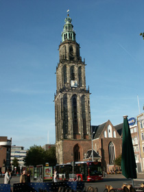 De zon schijnt en het is ca. 15°C. Mooi weer dus om een wandeling door de stad te maken. Met z'n vijven rijden we naar het centrum en zien allerlei bezienswaardigheden. Ik noem de Martinitoren, het Casino, de Vismarkt, de Korenbeurs (op dit moment is in het gebouw een filiaal van Albert Heijn gevestigd). We nemen ook een kijkje in enkele winkels waaronder een Marokkaanse zaak. H&W kijken of ze ergens een leuke poster kunnen kopen, helaas slagen zij daar niet in. Maar dat mag de pret niet drukken, want het is best een leuk en gezellig centrum. Je moet alleen wel uitkijken voor fietsers. ![]() |