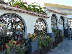 Door een leuk hekwerk met bloemen komen we op het kleinschalig terrein met een paar trappen. Ons wordt appartement nr. 101 aangeboden, aan het eind van de rij op etage 0. Dat is net onder straatniveau. Totaal zijn er drie woonlagen die in een flauwe S bocht liggen. Kleine tuin, zwembad plus kunstgrasstrook met ligbedden. En bij dat zwembad een bar met terras. |