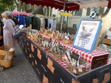 Van de wekker worden we wakker… met de rolluiken en al dat groen voor het raam is de slaapkamer erg donker. Als de was te drogen hangt lopen we naar het centrum van Cavaillon voordat het te heet wordt. |