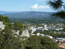 11:30 uur thuis even bijkomen en dan met de auto naar de supermarkt voor de laatste boodschappen. Aansluitend rijden we naar boven. Cavaillon ligt namelijk tegen een heuvel met daarboven aan de westkant een kapel, dit is de St-Jacques-kapel. Van die kapel zien we niet veel, maar des te meer van het uitzicht over de stad. De top van de berg is best breed… er wonen dan ook mensen in woningen met grote tuinen. Wel meestal achter heggen en muren. |