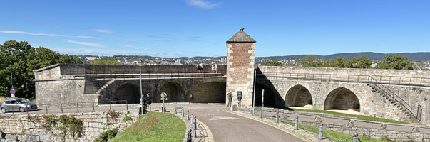 In Besançon is het 26 graden en volop zon. We benutten de rest van de middag om de citadel hier te gaan bekijken. We parkeren op een terrein en met een bus kunnen we mee naar de citadel, een rit van 7 min. die best wel steil omhoog gaat. De chauffeur stuurt behendig door enkele zeer smalle bochtige straatjes. De Citadel van Besançon is een 11 hectare grote vesting. Gebouwd tussen 1668 en 1711. De citadel is gelegen op een van de zeven heuvels die de stad beschermen. |