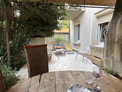 Goed geslapen, geen ventilator nodig gehad. Er is een airco in huis maar die hangt in de woonkamer. We worden pas om 09:45 uur wakker… heel laat voor ons doen. Ontbijten doen we aan de ronde tafel op het terras. Het is er heerlijk. Blauwe lucht voor zover we het kunnen zien want de begroeiing is massaal. Na het douchen wordt de wasmachine aangezet. Luie dag verder. En het wordt een warme dag, 29 graden en bijna geen wind. Gelukkig is er veel schaduw in de tuin. Lastig zijn de kleine mugjes… die steken. We zijn een poosje bezig om een restaurant te zoeken, want er zijn er heel veel gesloten. Het lukt om bij restaurant Le Bouchon Lyonnais in het noordelijke deel van de stad een tafeltje te reserveren. |