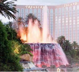 ![]() Treasure Island is niet in werking, maar we kunnen het piratenschip wel bewonderen. Dan naar de Mirage, ook zo'n groot hotel met een gigantisch aquarium in de enorme hal en als attractie de spuwende vulkaan. We staan daar buiten een kwartier voor te wachten en dan begint het gesputter. Met water en echt vuur en de juiste belichting heeft het wel wat. De schemering valt in, 't is nog altijd 35ºC. |