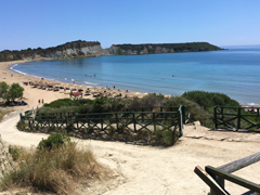 Het is warm als we uit de auto stappen. Het strand ligt beneden. Er zijn een paar slechte trappen om af te dalen. Het houtwerk is kapot. Maar op deze hoogte heb je wel een mooi overzicht van het strand en de rotswand van het schiereiland. Het zandstrand is lekker breed.